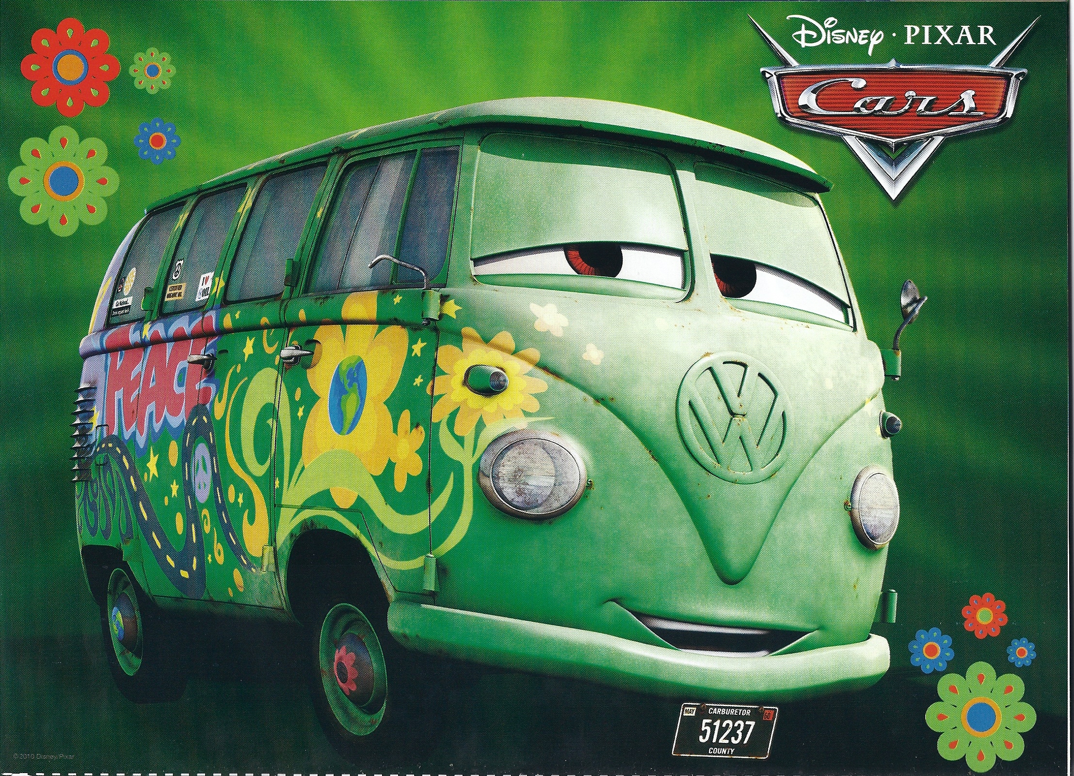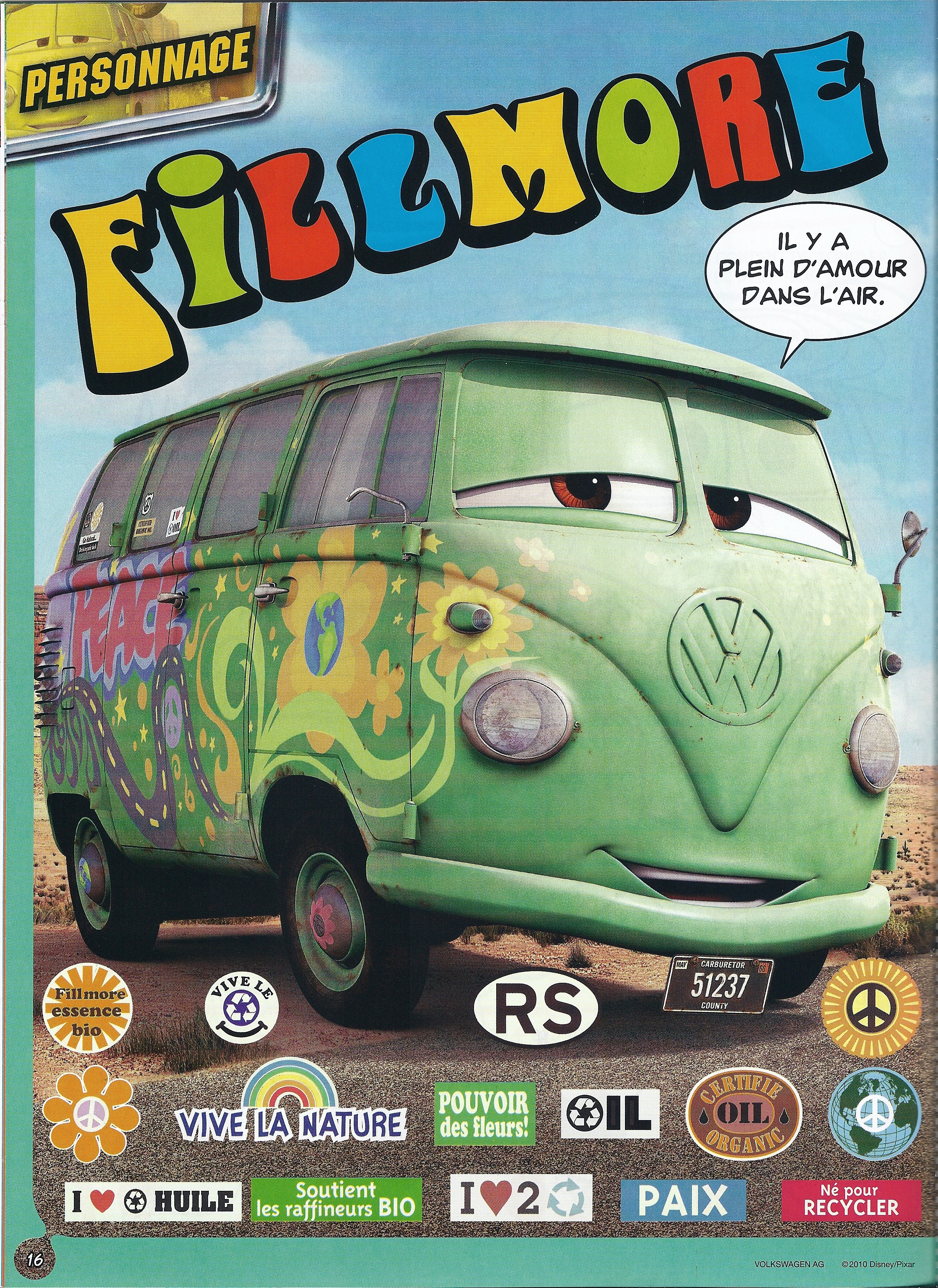 La page personnage est dédiée à Fillmore. Fillmore est un hippie qui vit à Radiator Springs. Fillmore fabrique de l’essence bio, et Flash Mcqueen est son meilleur client. Fillmore aime regarder le feu de signalisation avec son ami, Sergent.